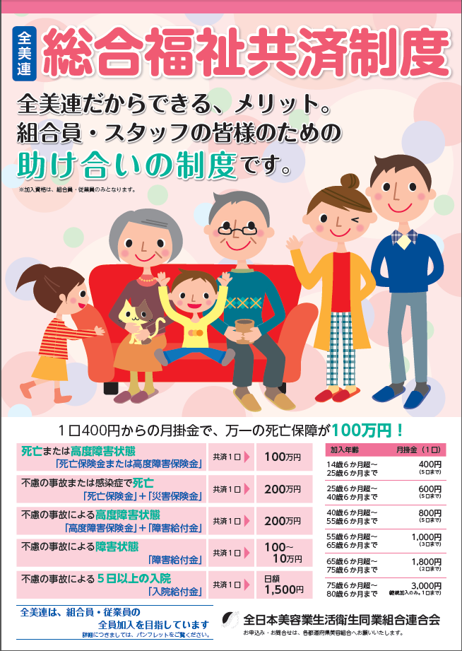 詳しくは別紙をご覧下さい。たくさんのお申し込みをお待ち致しております。 - 「全美連総合福祉共済」 「休業補償共済」の加入をお勧め致します